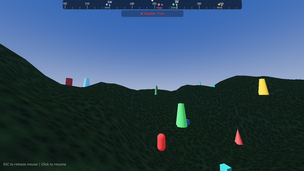 - The enemy NPC can get stuck in the terrain and I'm sure there are other places where the NPC or the player might get stuck, fall through or off. Just restart the demo if this happens.